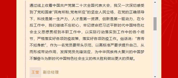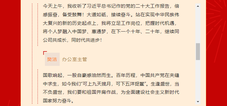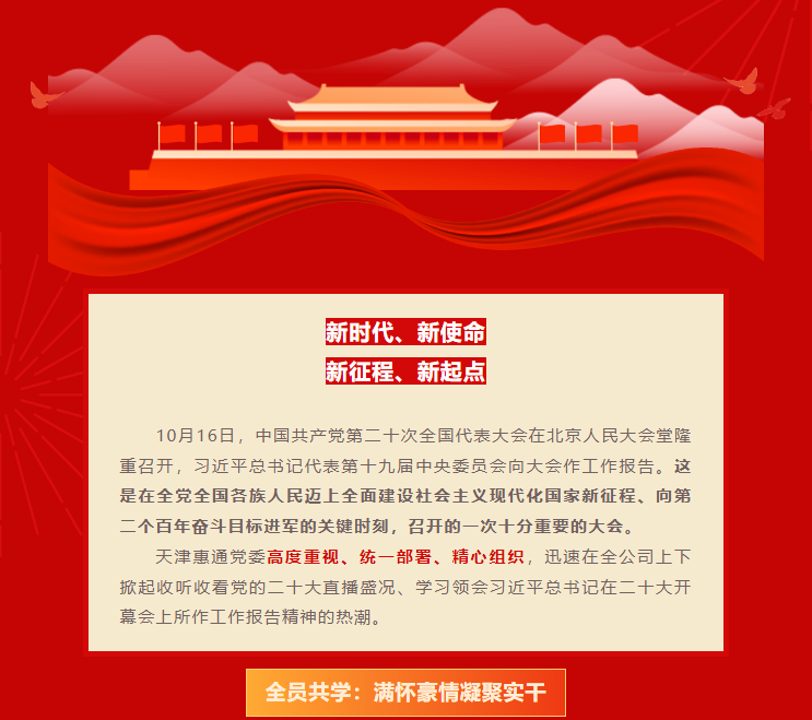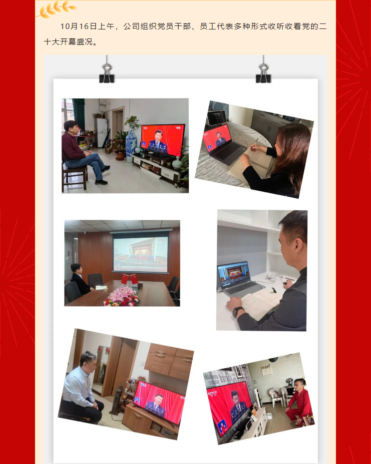 公司組織員工收聽收看黨的二十大開幕會(huì) 時(shí)間:2022-10-17 點(diǎn)擊:1726次 奮進(jìn)新征程 ★ 建功新時(shí)代 上一篇:【黨建園地】天津惠通黨員干部分享黨的二十大報(bào)告學(xué)習(xí)感悟 下一篇:公司開展“喜迎二十大,共慶祖國73周年華誕”主題活動(dòng)