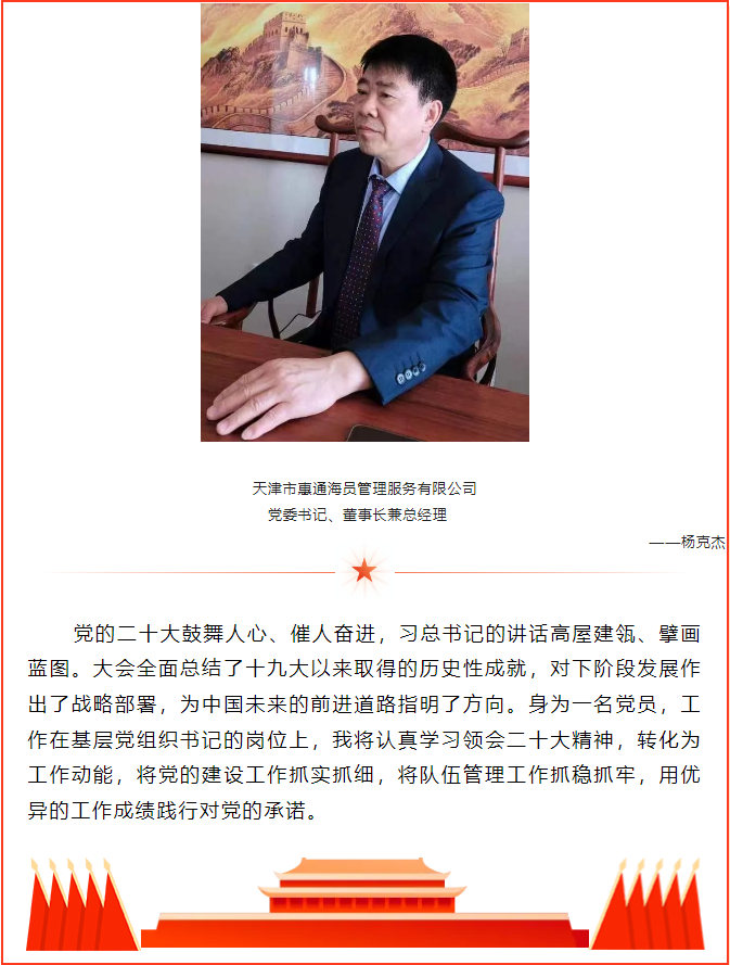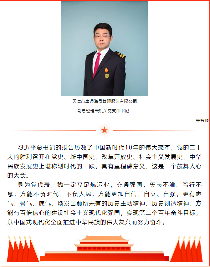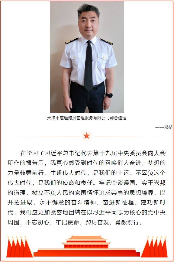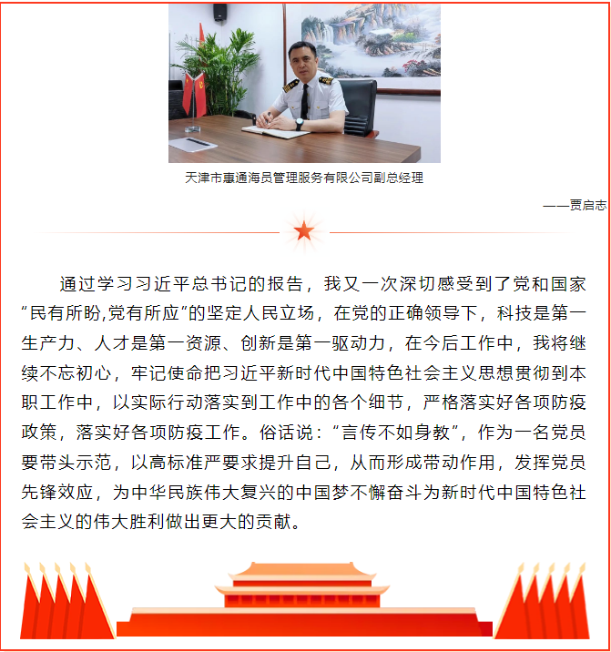 【黨建園地】天津惠通黨員干部分享黨的二十大報告學(xué)習(xí)感悟 時間:2022-10-19 點擊:1477次 上一篇:天津惠航國際船舶管理有限公司順利完成勞氏DOC2022年度審核 下一篇:公司組織員工收聽收看黨的二十大開幕會