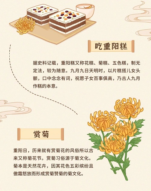 “九九老陽,陽極必變”,所以在九月九日,要前往山上登高望遠(yuǎn),祭拜山神以求吉祥。
