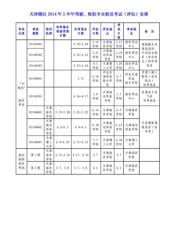 具體安排請(qǐng)?jiān)斠?jiàn)《天津轄區(qū)2014年上半年駕駛、輪機(jī)專業(yè)船員考試(評(píng)估)安排》(附件2)和報(bào)名須知,報(bào)名時(shí)請(qǐng)注意報(bào)名期數(shù)、報(bào)名時(shí)間和考試時(shí)間。